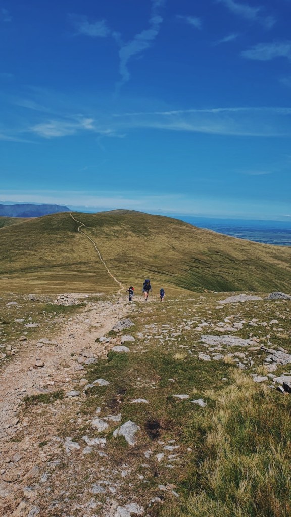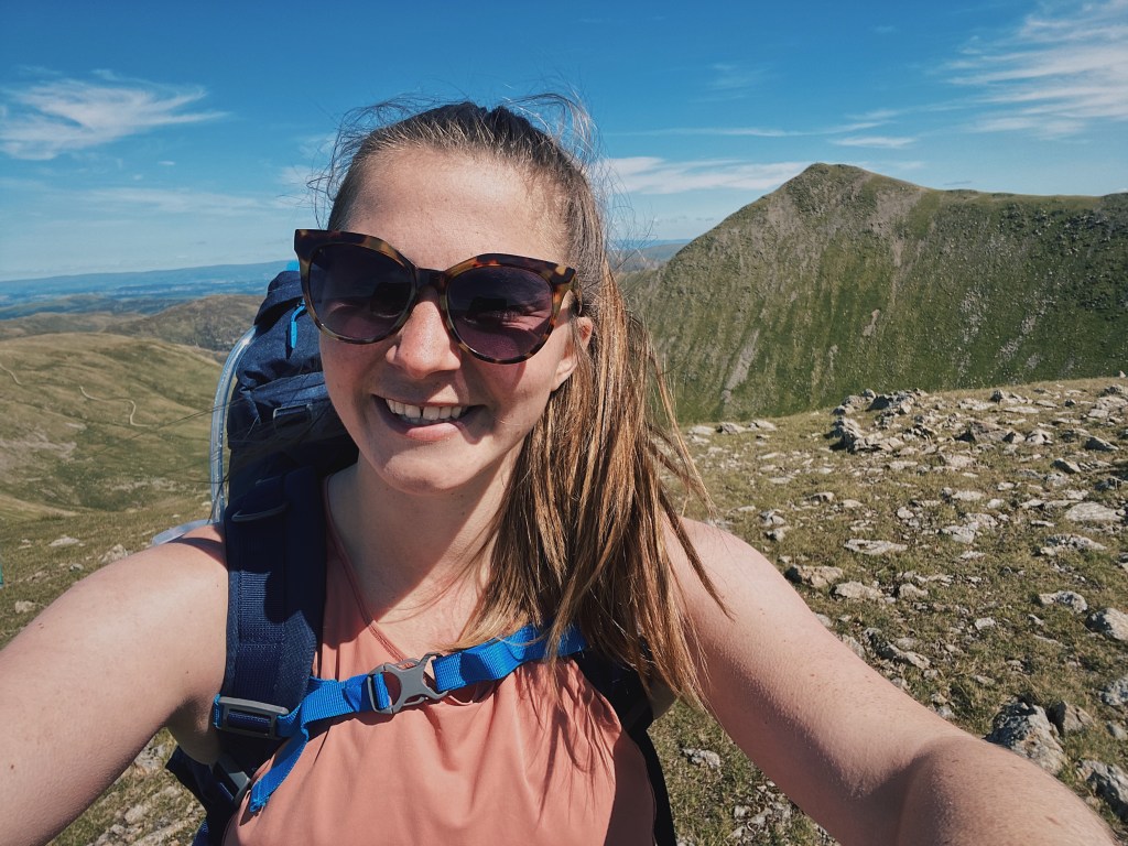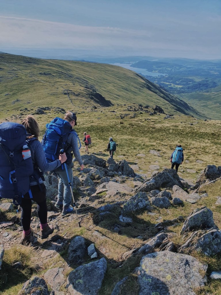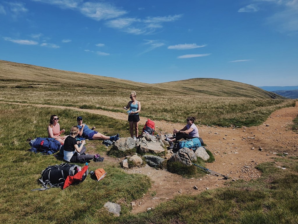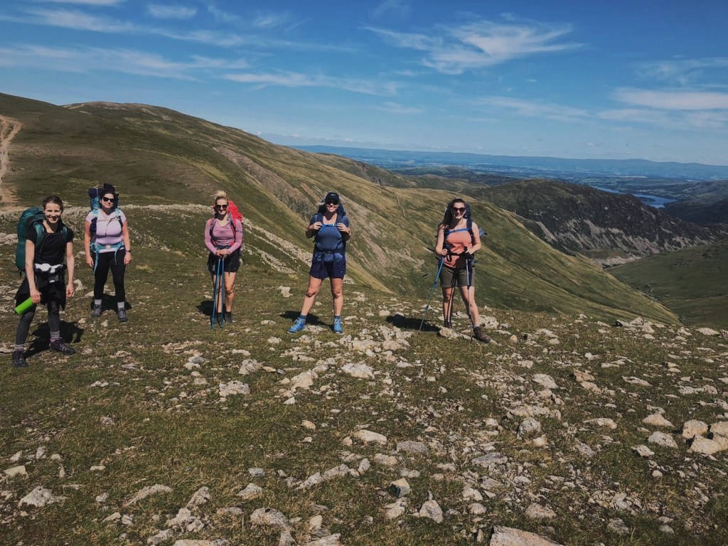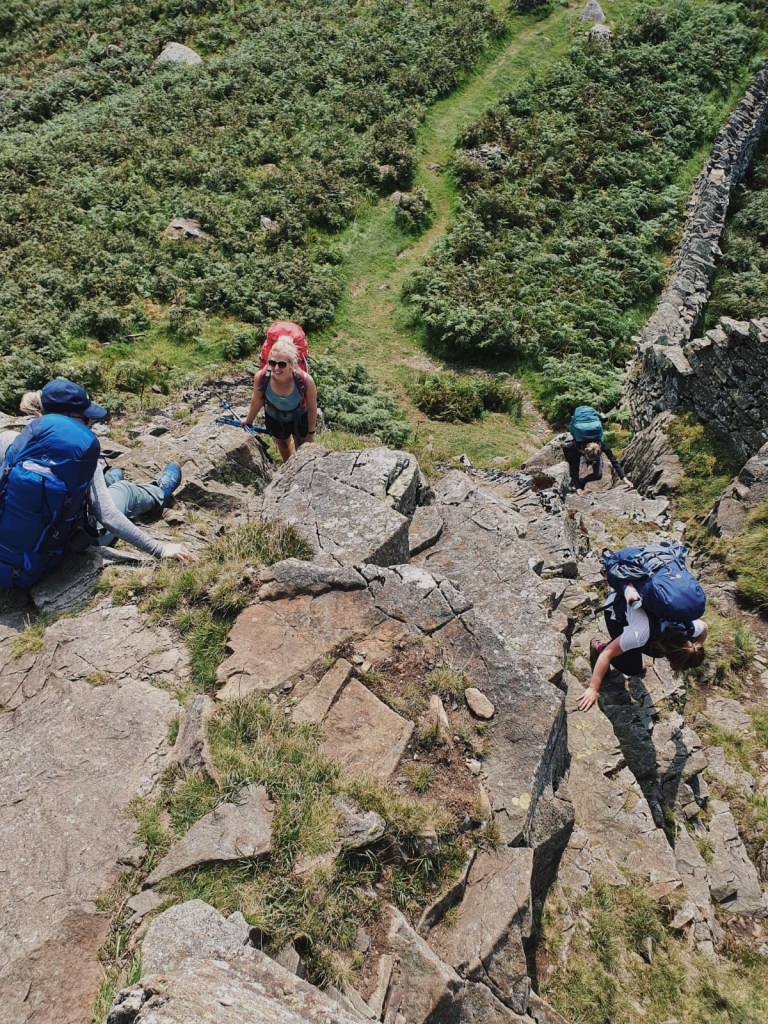 We marched out of the camp site winding our way up to Sticks Pass and onto Helvellyn. The first section was extremely steep and I underestimated the difficulty of this. With the heavy pack, the hot sun and not moving for the past 2 months of lockdown, I found this tough. With all the girls spurring each other on and with plenty snack/photo breaks its amazing how far you can go! The views the whole day were just staggering.