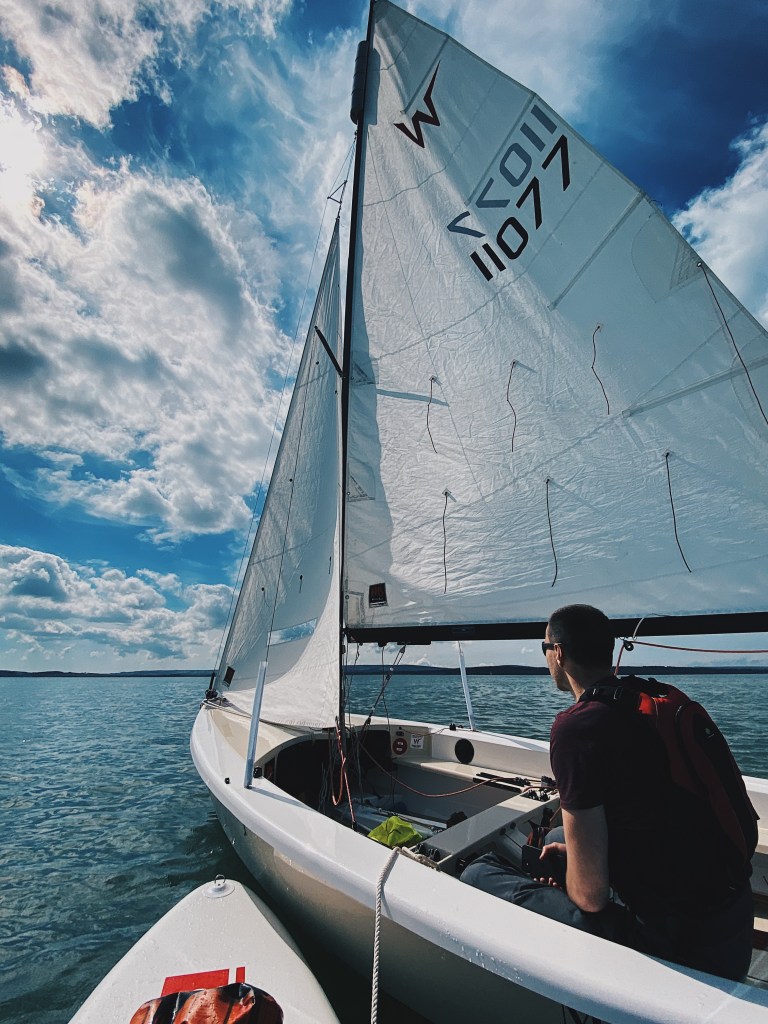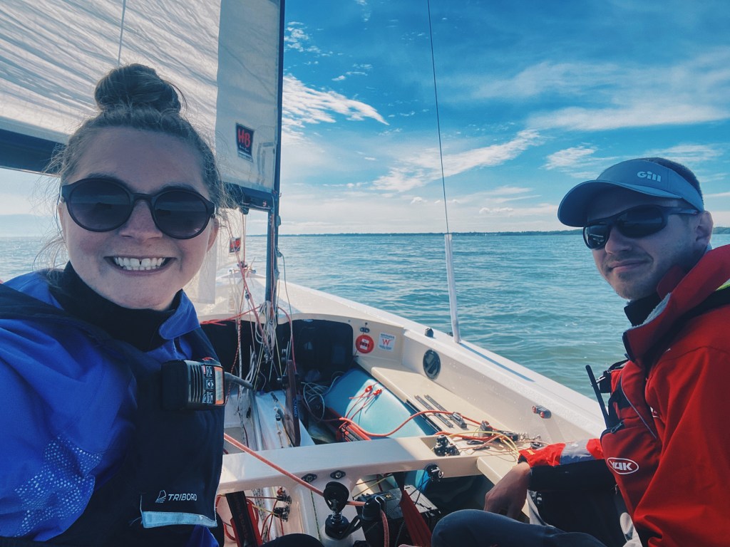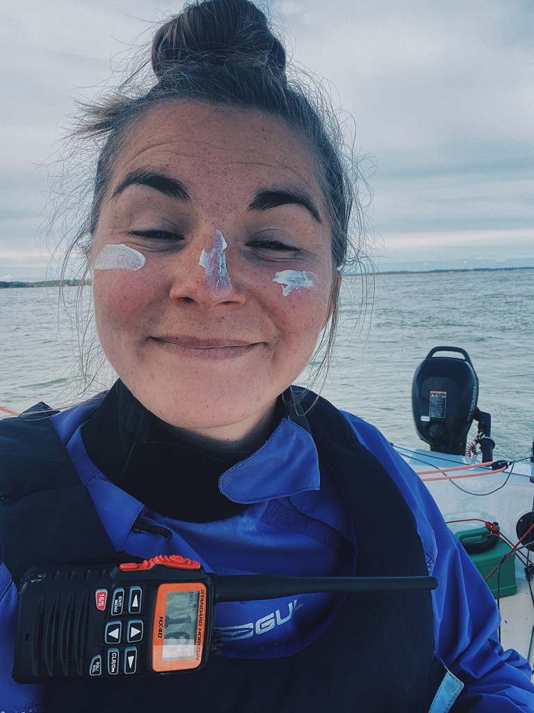 We motored down Beaulieu River and put the sails up when we reached the river mouth. We tacked West, into the wind, tacking our way back. After what felt like a strenuous morning, the wind got even lighter and I had very relaxing crew duties on the route back. I put on more suncream and an extra layer as my body cooled down. I also threw on my GUL lightweight spray top over my wetsuit to protect me from the slight chill and the sun.