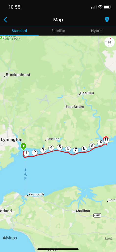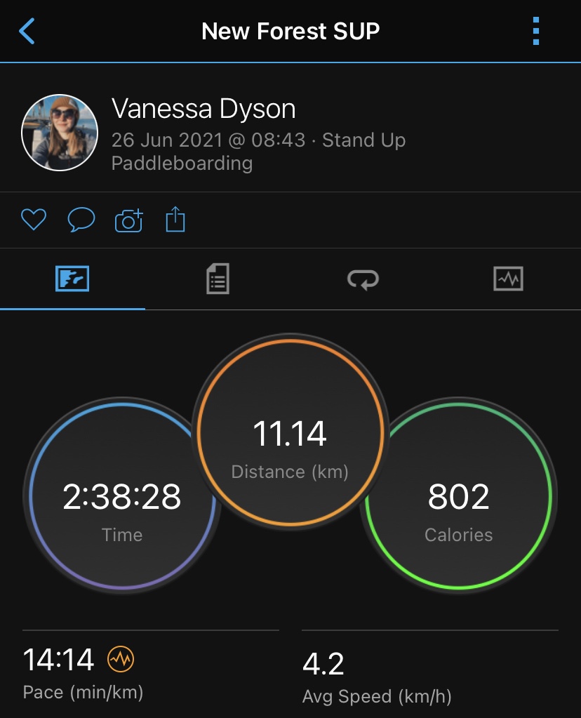 Below is the route I took on my paddleboard with some stats taken from my Garmin watch. I started tracking the route once Alex finished towing me out of Lymington and then I stopped the activity when Alex had to collect me before heading into Beaulieu River.