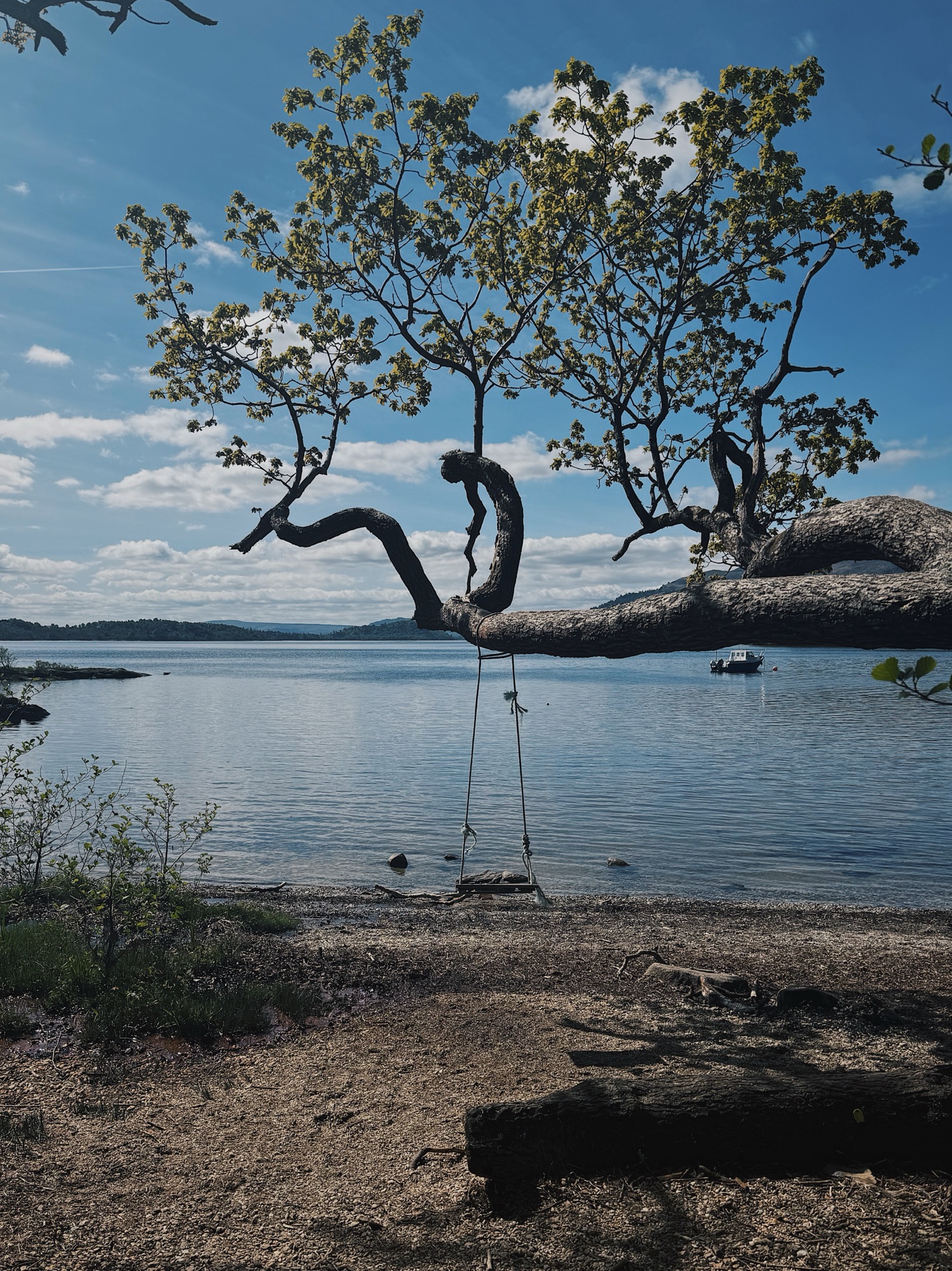 The route for Day 2 followed the edge of Loch Lomond the entire way. The water stayed on my left, disappearing only for brief moments before reappearing with another beautiful view. The weather was super sunny – clear skies and rather warm – but the trail itself was relentlessly uneven. Roots, rocks, twists and turns. It was hard to get into any kind of rhythm or stride.