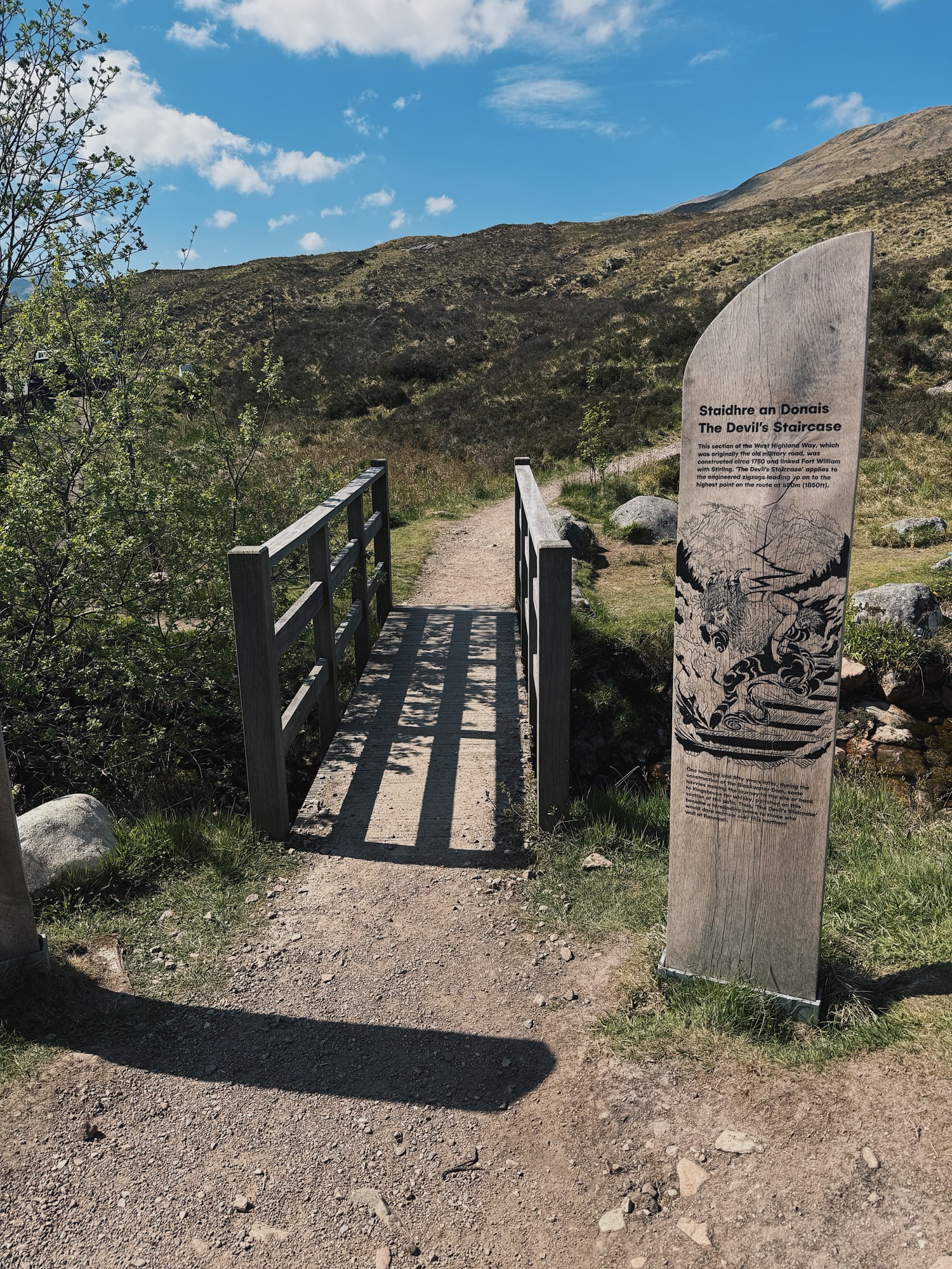 There was one section I’d been looking forward to for a long time. Around a decade ago, I worked for an agricultural countryside contractor, and we had a job along this very part of the West Highland Way. We’d been tasked with improving the path and rebuilding a wooden bridge over a waterfall. We stayed in a static caravan park nearby and would drive a 4×4 up a gravel track as far as we could. From there, we’d hike the rest of the way in – carrying supplies, tools, and materials. We’d do this over and over each day, lugging in everything needed before the real work began. I spent my days with my team mates digging out and resetting the stone path, or sawing wood and rebuilding the bridge by hand.