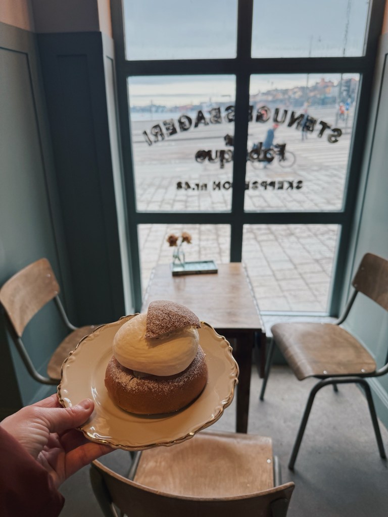 After fuelling up on breakfast, we headed into the city. It didn’t take long before we found our first coffee stop – and our first glimpse of a Swedish semla. Soft, cardamom-scented bun, almond paste, and a generous cloud of cream. It was every bit as good as we’d hoped.