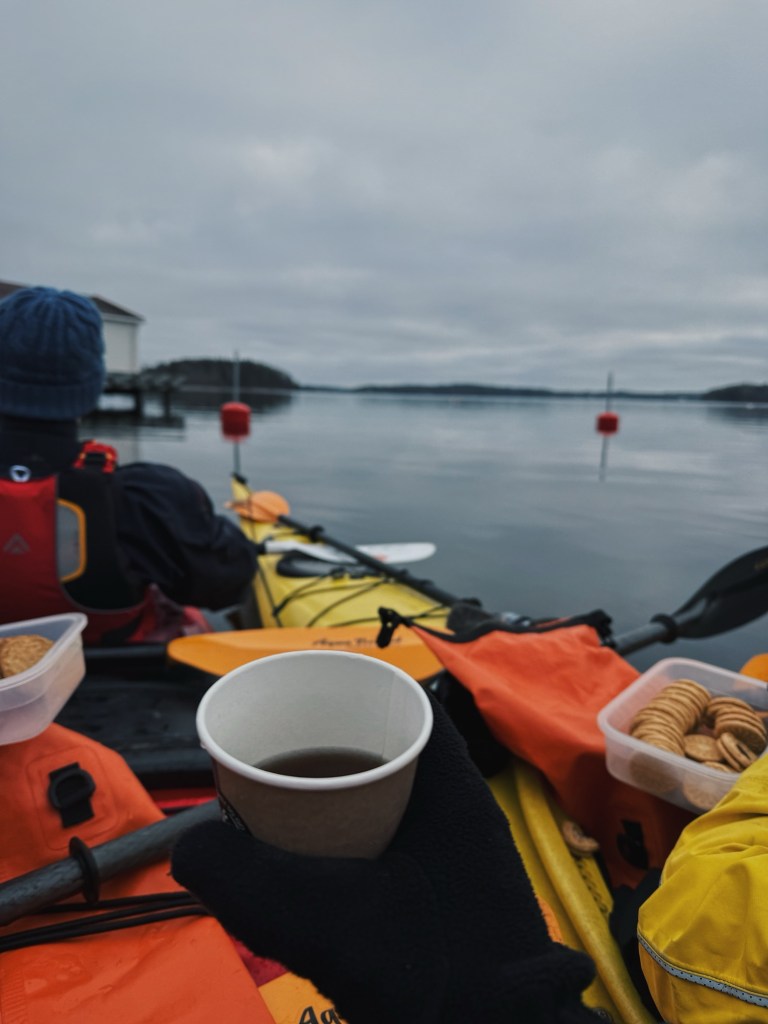 Partway through, we rafted the kayaks together for a floating fika. Hot drinks and snacks were passed around while we bobbed gently on the water, surrounded by the stillness of the winter landscape. It was one of those simple moments that felt very Scandinavian – cold air, warm hands from a hot drink, and nowhere else you needed to be.