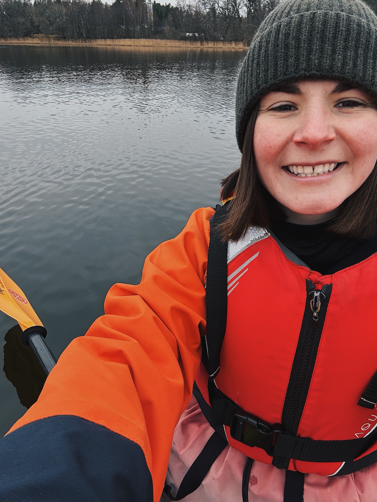 Partway through, we rafted the kayaks together for a floating fika. Hot drinks and snacks were passed around while we bobbed gently on the water, surrounded by the stillness of the winter landscape. It was one of those simple moments that felt very Scandinavian – cold air, warm hands from a hot drink, and nowhere else you needed to be.
